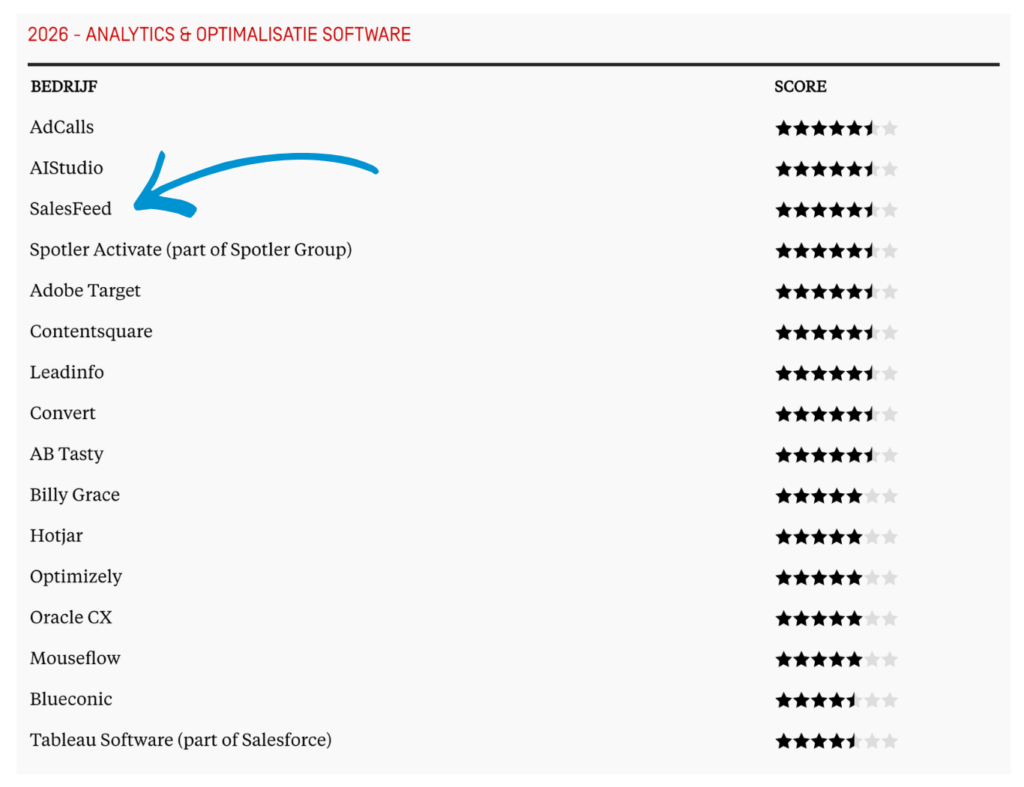 Voor het zevende jaar op rij staat SalesFeed in de Emerce 100. Je vindt ons in de categorie “Analytics & Optimalisatie Software”.