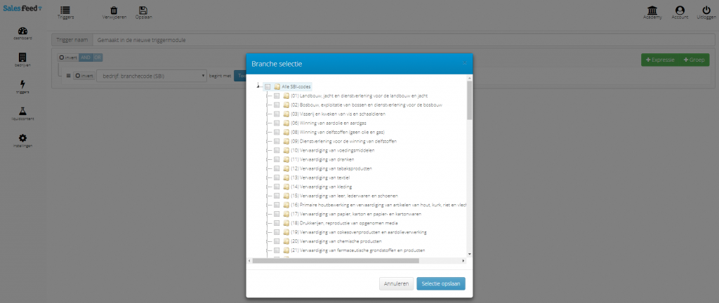 U kunt nu een selectie maken uit de SBI-lijst door de van toepassing zijnde branches aan te vinken. Deze lijst is altijd up-to-date.