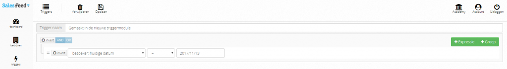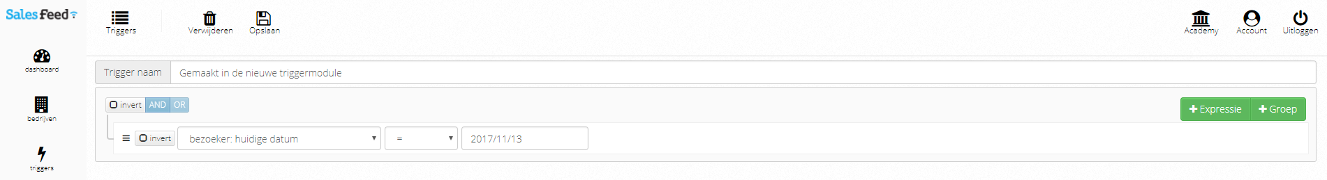 Hiermee wordt de trigger vanaf een datum, op een datum of in een datumbereik actief. Bijvoorbeeld nuttig als er een grote campagne wordt voorbereid.