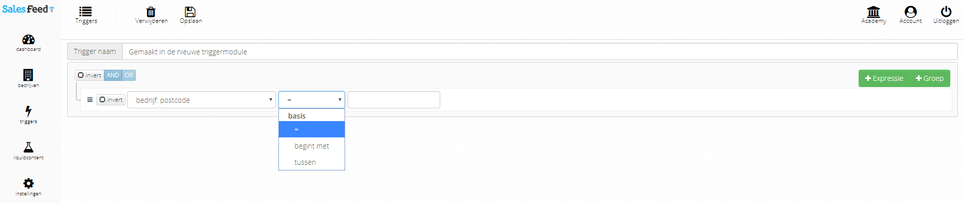 Als u de postcode van een bedrijf in een trigger wilt opnemen worden alleen nog de filtermogelijkheden getoond die van toepassing zijn.
